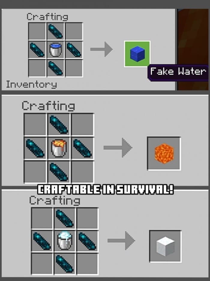 The Fake Liquid Blocks mod lets you troll your friends in Minecraft PE (Bedrock) using new blocks. These blocks look like liquids, but they aren’t actually liquids. And the funny thing is, they look just like the real thing.