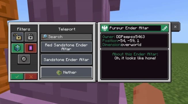 In the interface you will be able to observe measurements, if you open them and put there an altar, you will be able to teleport there in Minecraft PE (Bedrock). It is also worth noting that each teleport will cost you 3 experience.