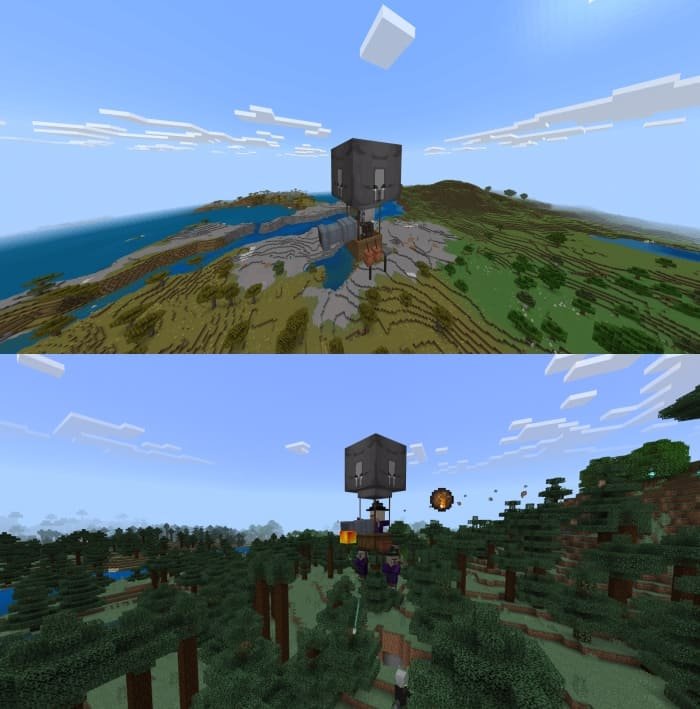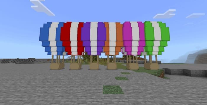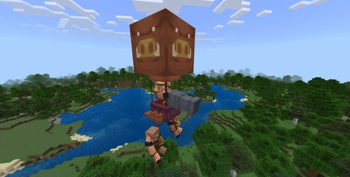 The mod adds to Minecraft PE (Bedrock) various balloon mobs that will fly and attack you or offer the player to interact with them. For example, while defending their village, the balloon dwellers can fly and destroy their enemies or you can meet a flying roaming merchant with whom you can trade directly while flying.