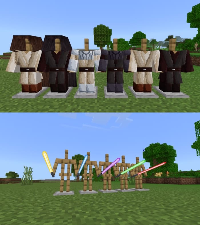You can develop your Jedi skills with lightsabers. Choose your color and enter the battle. Also, new armor will be added to Minecraft PE (Bedrock).
