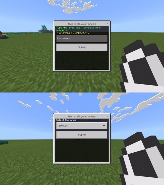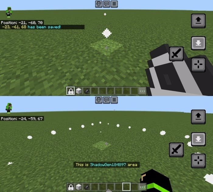 To get started with this add-on to Minecraft PE (Bedrock), create a key of your region: 6 blocks of iron and 1 flint. Then take the resulting key, go to the desired area and just sit down and click on the block of initial coordinates, and after - the final coordinates. You can customize the name of the area and its location in the region form. To make sure that the boundaries are set correctly, you will be highlighted their edges.