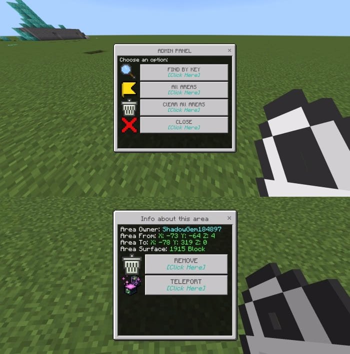 To access the admin panel in Minecraft PE (Bedrock), you need to get the zones admin tag: /tag @s add LandAdmin. The admin panel allows full control of all regions, including deleting them or finding and teleporting to them. The admin can see the exact location of each region and its owner (even by key), as well as delete absolutely all regions at once.