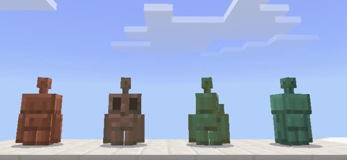He can be spawned by placing a pumpkin on a copper block. He will activate mechanisms: press buttons, stand on tiles. Also the copper golem can oxidize, put honeycomb on it so that it does not oxidize. And you can remove the oxidation with an axe.