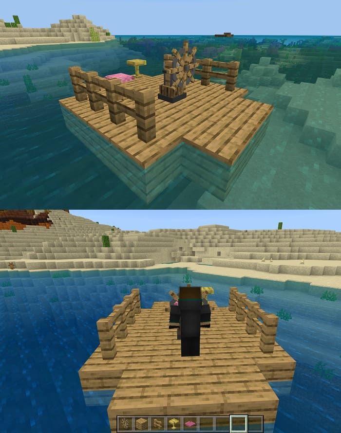 Just take and build your ship in Minecraft PE (Bedrock), decorate it however you want. And then, put the helm to activate it and you'll be all set! You'll be able to sail!