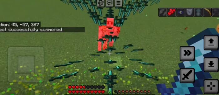 It is crafted from 7 diamond blocks and 2 lower world stars. When you attack it, additional swords will immediately appear to attack your enemy in Minecraft PE (Bedrock). The sword will have several types of attack.