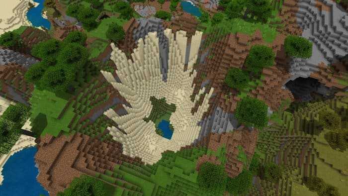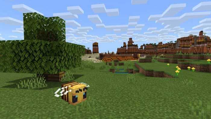 This sid for Mynecraft PE will shock you with its charms and its uniqueness. After you sleep, there you will head forward, then you will see a village in the savannah biome.If you decide to continue your path forward, in this direction, you can reach the split savannah plateau (mountain), which will intersect with the mesa biome. And to the right of this mountain, the desert village will be located in the mesa area.In one part of the mountain, there will be a cave of skeletons, and to the left an outpost of brigands.However, if you walk backwards from the spawn, you will find really steep ledges that look like a crater full of sand. Well after that you can turn around and reach the tree with a beehive in Minecraft Bedrock Edition.