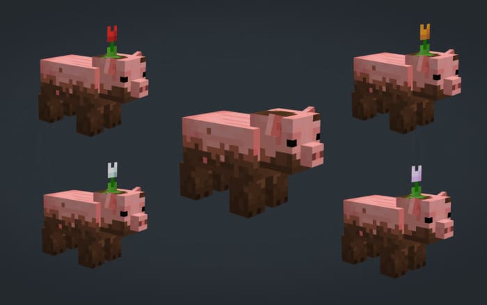 The Barely Default Pigs resurspack will improve the pigs in Minecraft PE (Bedrock) by adding different 3D elements on the textures. In addition, several variants of pigs will be added to the game: dirty, boars, with flowers.