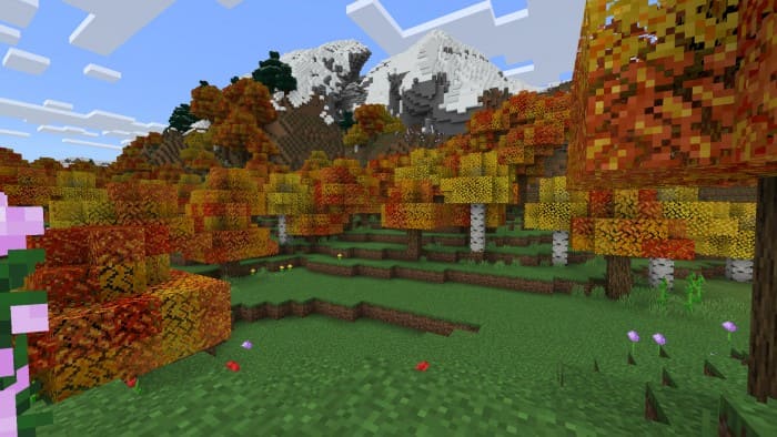 Nature in Minecraft PE (Bedrock) is an important element of the game world. In the standard version of the game, the leaves on the trees always remain green (except in winter). And this pak will give the leaves different colors: yellow, orange, red, purple.