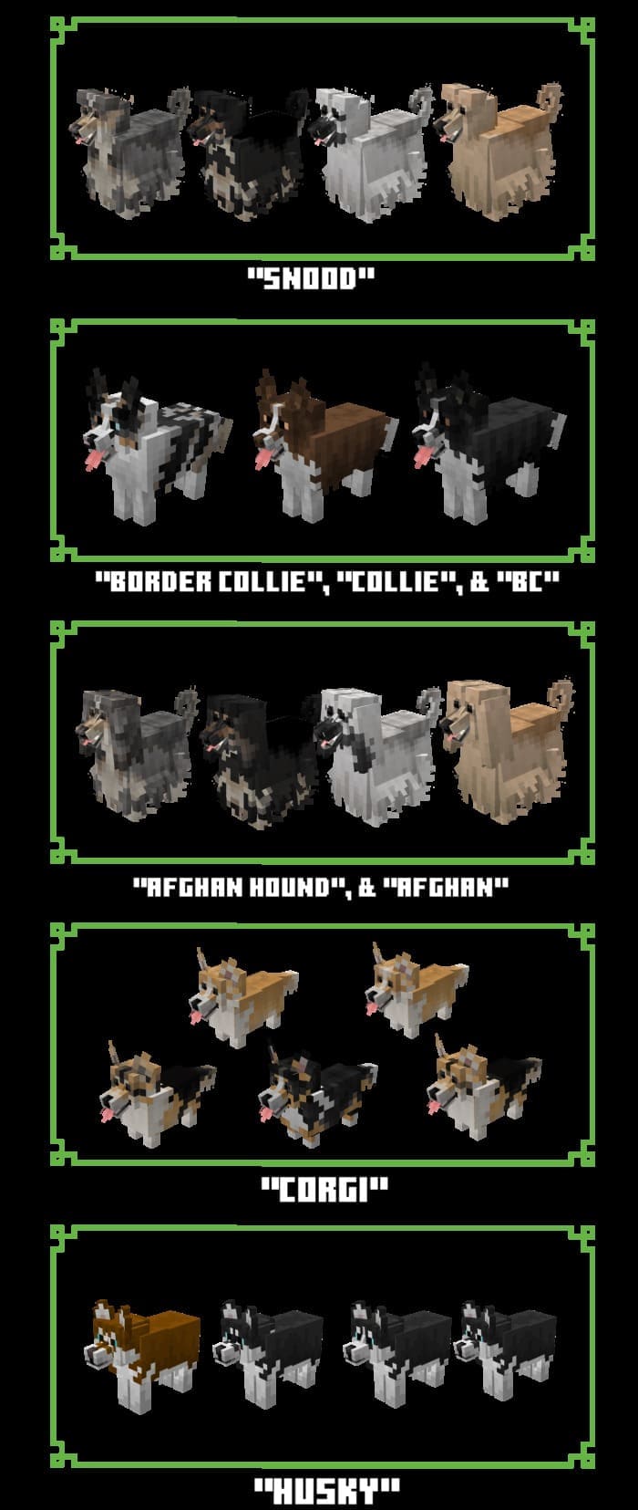 At the bottom, you can see the name of the tags (you can name them in Anvil) that you need to give your dog to turn it into a defined breed in Minecraft PE (Bedrock).