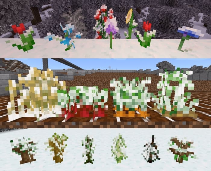 Below you can observe some screenshots of how winterized the plants in Minecraft PE (Bedrock) will look. Well, it's also worth noting that some blocks in the game will also be covered in snow.