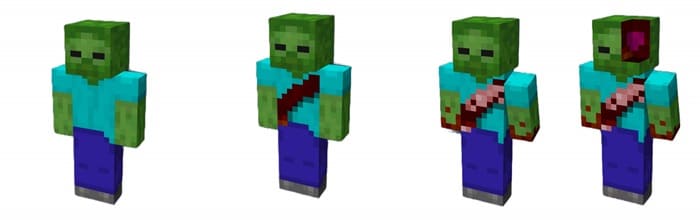 On the example of zombies you can see how it will look. The less health the mob has left, the more wounds in Minecraft PE (Bedrock) you will see on it.