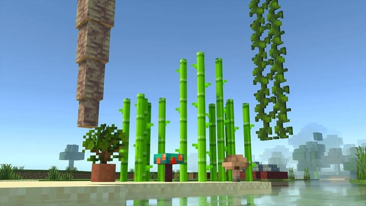 This texturepack works without changing the original style of Minecraft PE (Bedrock), adding volume only to certain blocks, including sugar cane, vines and mushrooms. The 3D effects are best when used with shaders, making them especially appealing in bright and shadowy scenes.