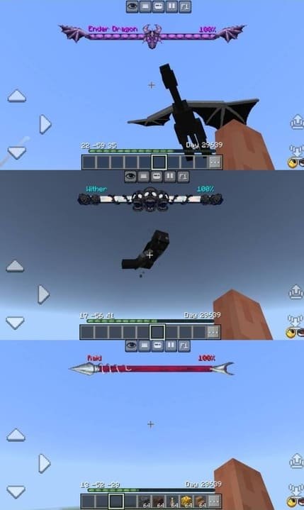 The health bars for Visor, Dragon End, and Raid have gotten a more modern visual design. The boss name is now placed on the left and the HP percentage on the right. This approach improves readability and makes the fight more informative. All panels are adapted to the vanilla style of Minecraft PE (Bedrock), so they do not break out of the overall aesthetics.