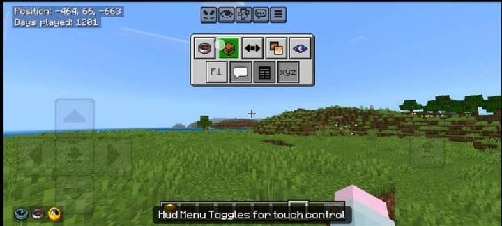 The pack includes a unique HUD system with interactive toggles that can be accessed directly while playing Minecraft PE (Bedrock). It can be activated by tapping the "HUD" or "Déesse" button (on touchscreen devices).