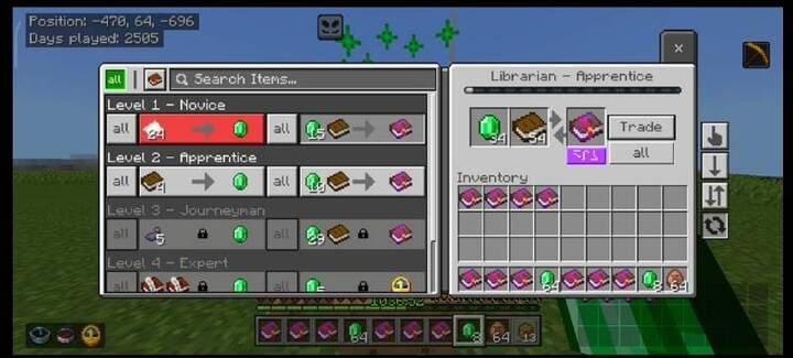 Features include: a debug screen (height, chunk, slimes, moon phases), an inventory HUD with item display, a player list (accessible via the TAB key), night vision with brightness adjustment, and much more.
